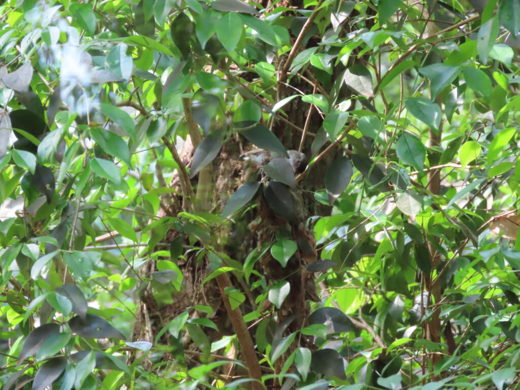 Hace un nido digno de un gran arquitecto, con techito en la entrada. Hace por lo menos 20 años que anida y se refigia en el jardín selva y se mantiene cerca de la casa más selvática.