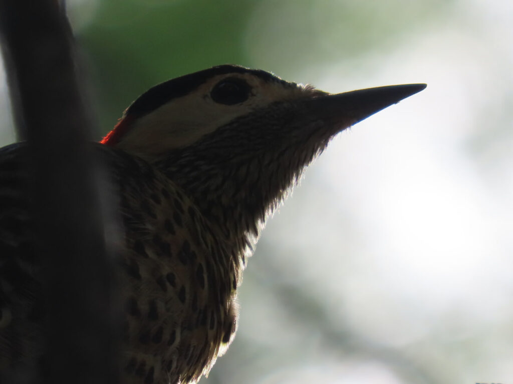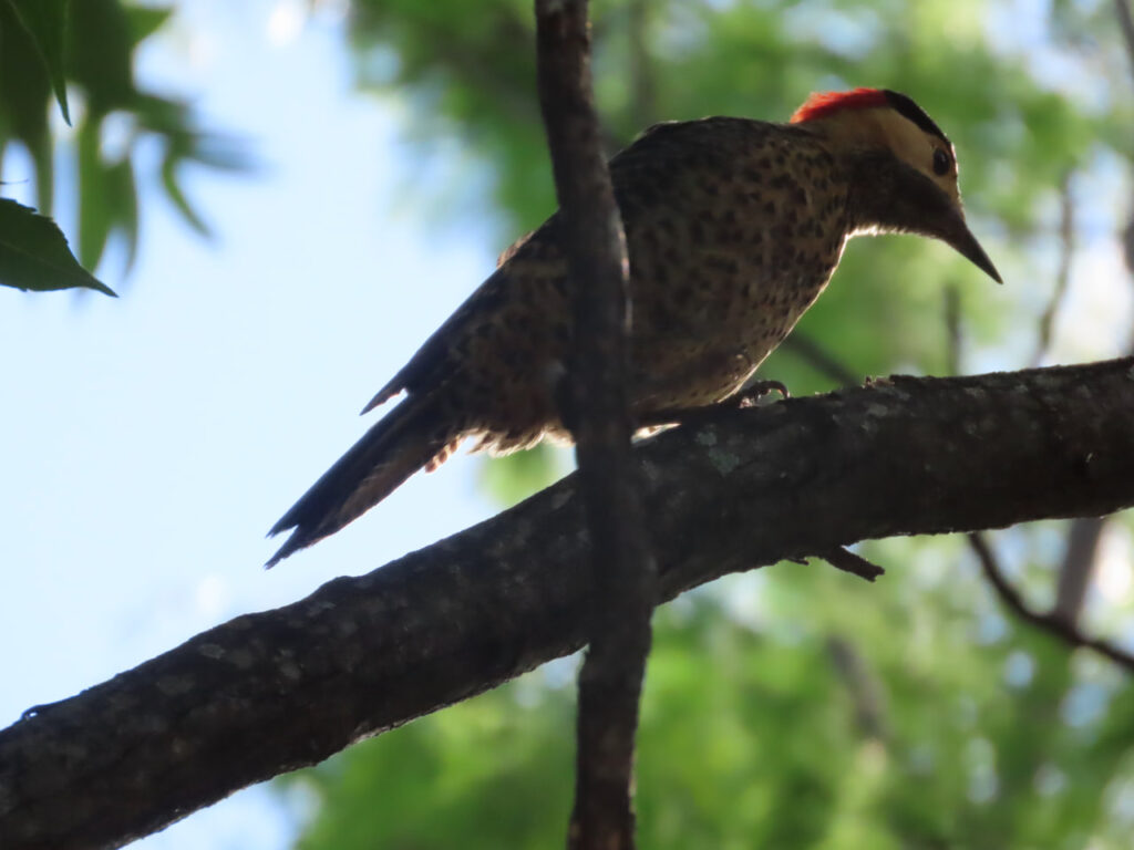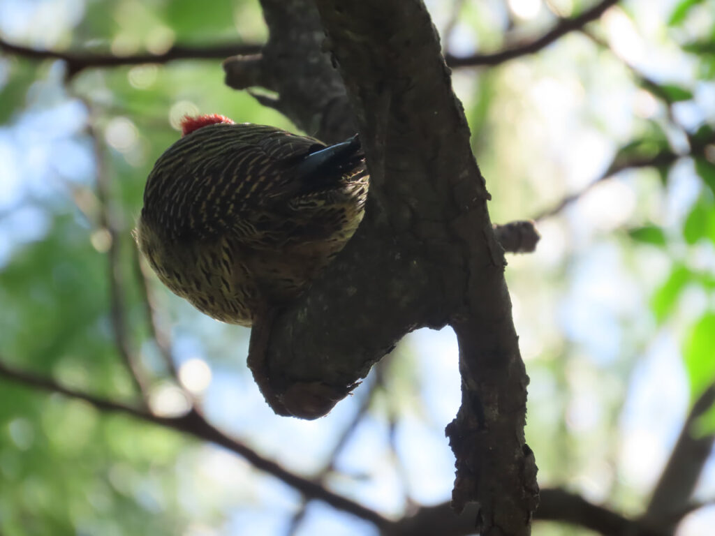 No es el único carpintero que vive en el jardín selva, también hay varios carpinteritos, que suenan muy fuerte para el tamaño que tienen buscando alimentos en ramas finas, uno de los Picumnus. El carpintero garganta estriada, Hilatomus lineatus y también bandadas de los carpinteros blancos Ypequy la novia, Melanerpes candidus.